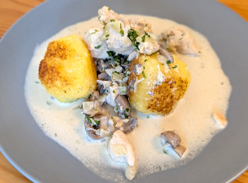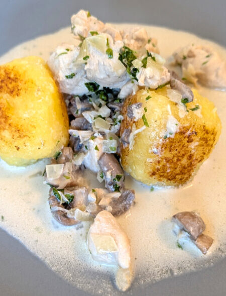 Cremiges Hähnchengeschnetzeltes mit Pilzen & knusprigen Kartoffelknödeln